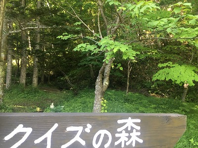 山頂を過ぎるとたどりつくのがクイズの森。中には問題が書かれた看板が立っており、次の番号の看板にたどりつくと答えがわかる仕組み。でも次の看板がどんなに探しても見つからない!と迷宮入りすることもあります。