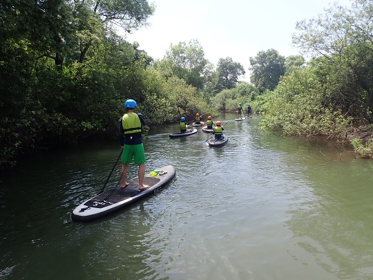 SUPはサーフィンのロングボードのようなもので、パドルを漕いで川や湖、海を進みます。