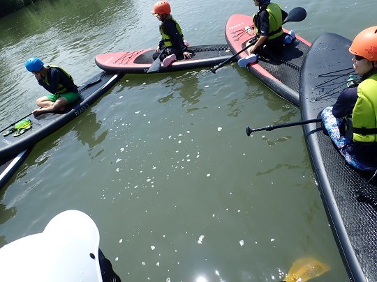 皆で連結して円になったSUPをクルクル回転させながら進んだり、SUP相撲やったり。
