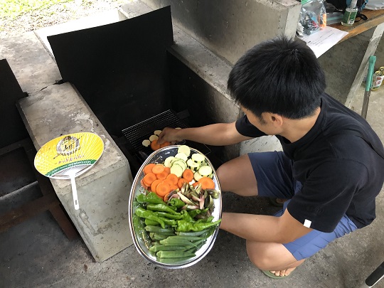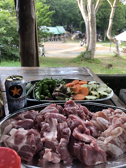 SUPが終わったら温泉入って、地元食材を買い出し、野沢温泉スキー場にある巣鷹湖キャンプ場でBBQ。