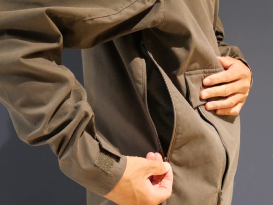 換気と脱着をスムーズにするため長めのサイドジッパーが配されています。