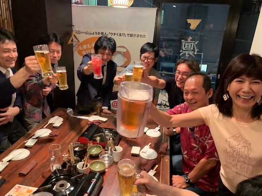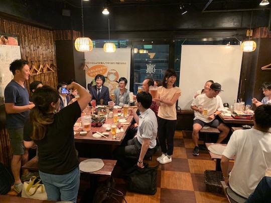 そして、報告会終了からの懇親会。滝さん、秋本さんの挨拶で乾杯!