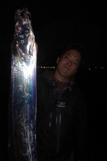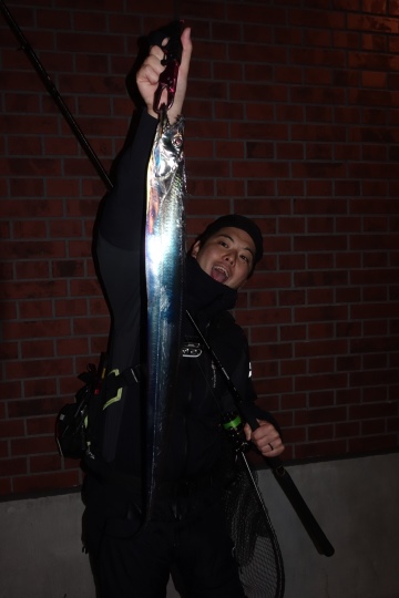 タチウオの大きさは指の本数で表すのですが、指4本分もある大きなタチウオが陸から釣れるんです。