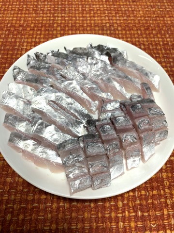 タチウオは皮つきのまま食べるのですが、下に写っているような横方向にも切れ込みを入れた刺身の切り方が川が口の中で残りづらく美味しく食べられます。上に写っているのはこの後バーナーで炙って美味しくいただきました。