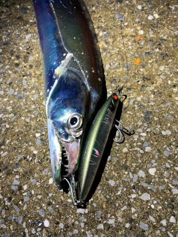 普段はワーム(ゴム製の疑似餌)で狙うことが多いタチウオですが、最近食べられているベイトが12cm程のマイワシで、ミノー(プラスチック製の疑似餌)でもガンガン釣れてきます。