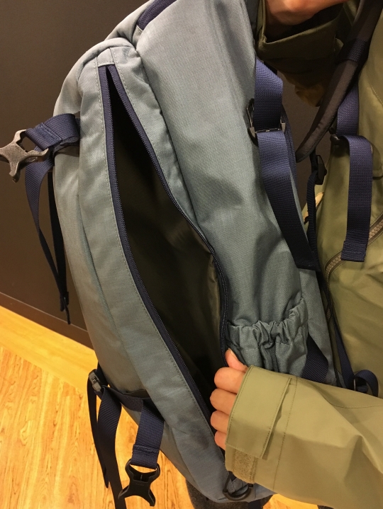また、アバランチギア(ショベルやプロ―ブなど)を入れる荷室もロールアップ式で上部から取り出すのではなく、サイドのジッパーを開けて取り出すよう変更。ここは、他のザックではなかなか見られないオリジナルの仕様です。