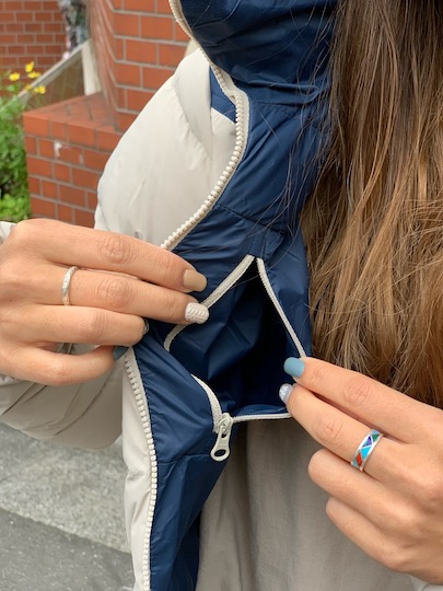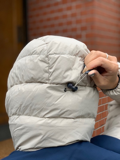 ヘルメット着用を想定してフードは大きめ、ドローコードも