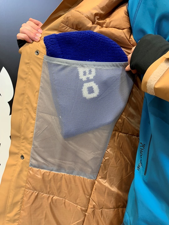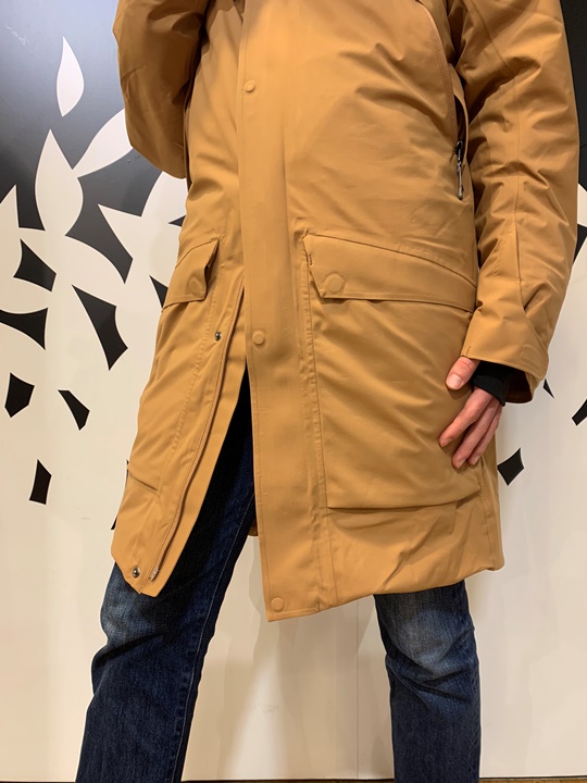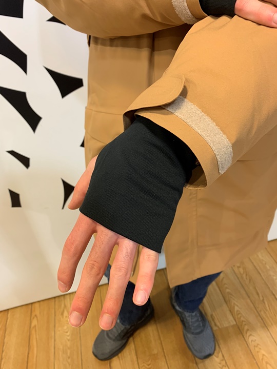 脇下のハンドウォーマーポケット内にはドローコードがあり、腰回りのフィット感を調節できます。