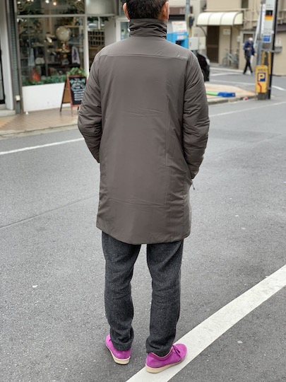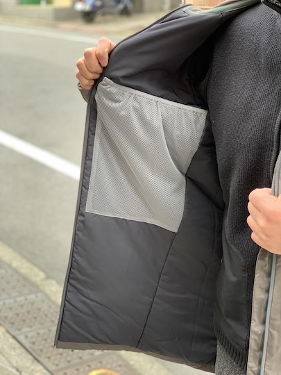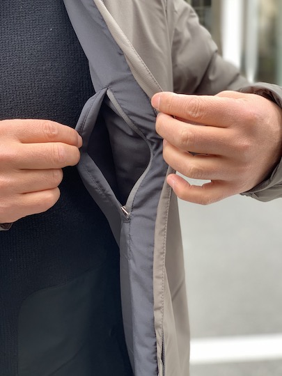 ご存知のプリマロフトから高性能のゴールドアクティブを用いた、保温性が高いロングジャケットですが、約465gととても軽く柔らかいタッチ感です。