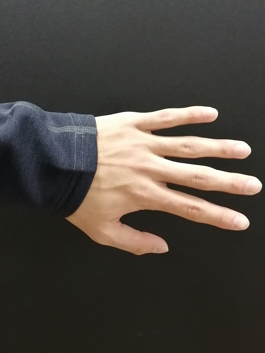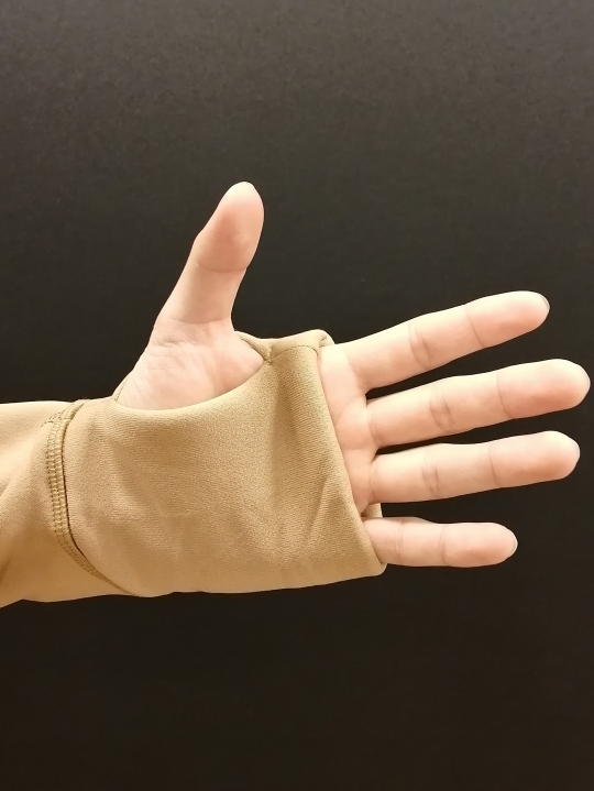 袖のサムホールは、手のひら・甲をすっぽり包みます。
