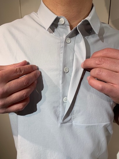 胸元のボタンを隠す一手間がかかっているのがHOUDINIらしさ。
