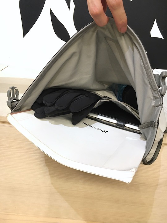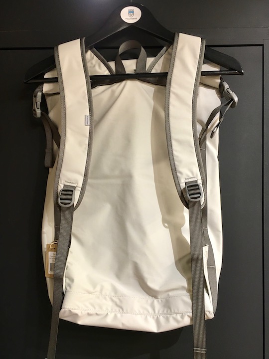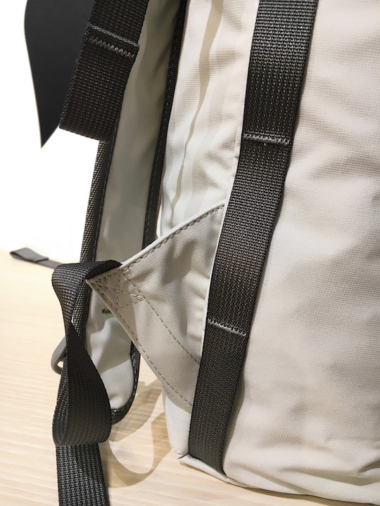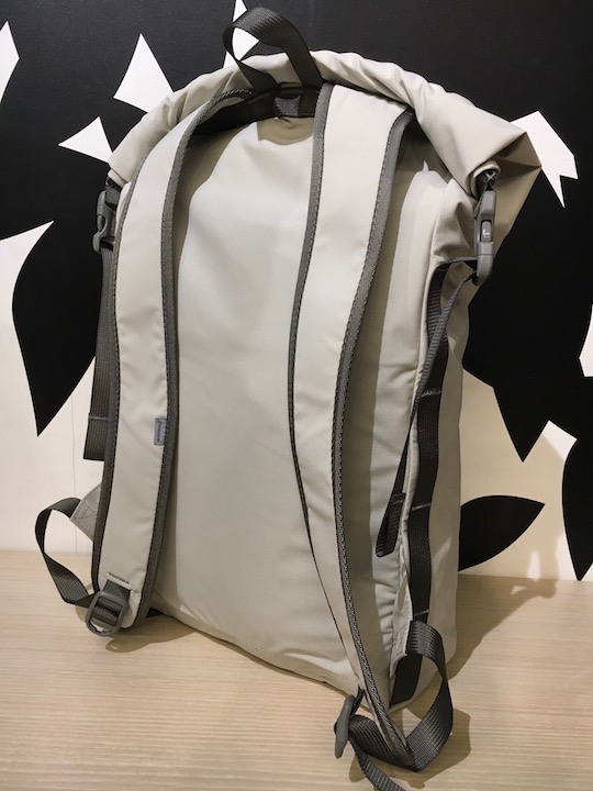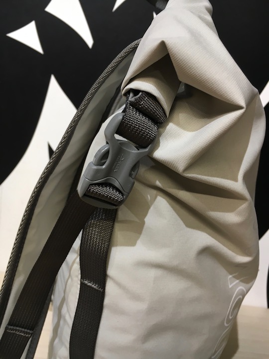 メインの開口部はロールトップで、くるくると巻いたら左右にカチッと留めることができます。軽くて小さくなるスグレモノですが、肩のストラップや付け根はしっかりとした構造を持っているので旅行などのサブバッグ、登山のアタックザックとしても十分に機能します。
