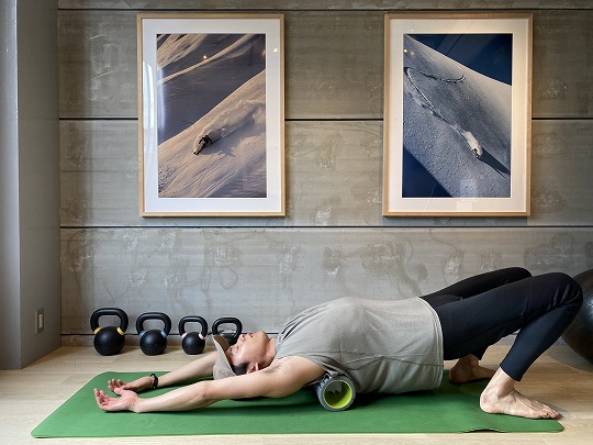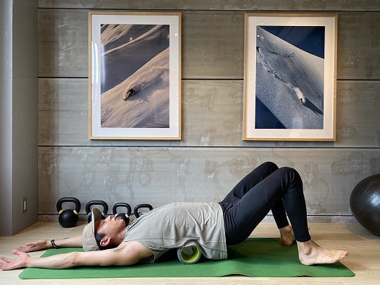 ①フォームローラーを背中の中央にセットします。(フォームローラーが無い方は、厚手のタオルでもできます)