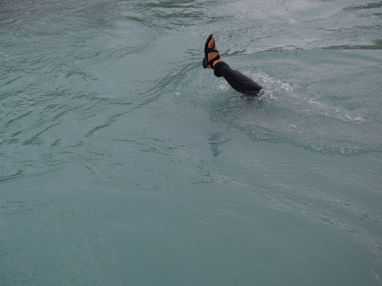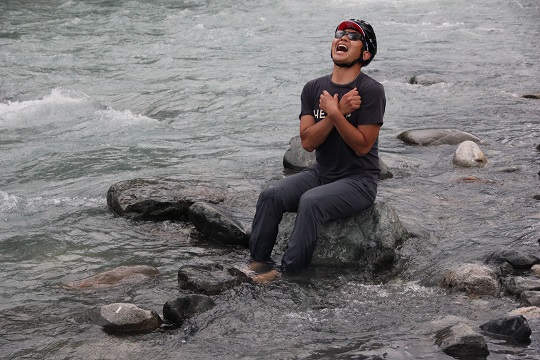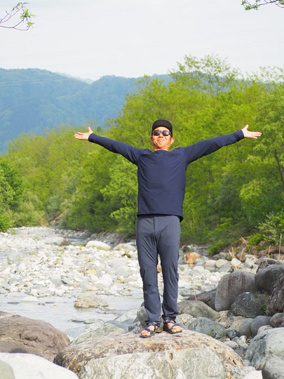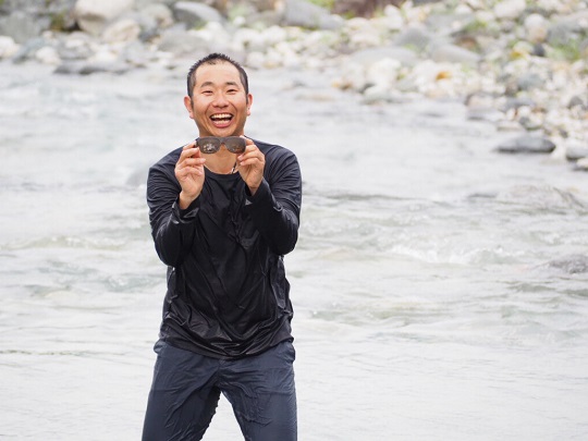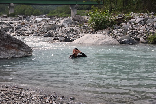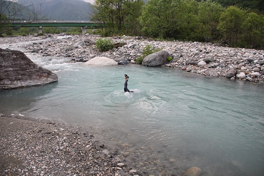 「ちょっと川に入って濡れてる写真撮りましょ。」