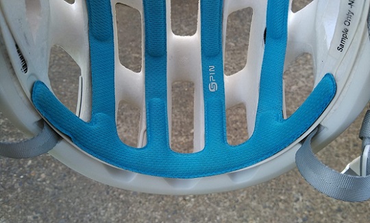ヘルメット内部の水色のパッドが転倒時にヘルメット内で頭を少し滑らせ、脳へのダメージを軽減するSPINを搭載しています。