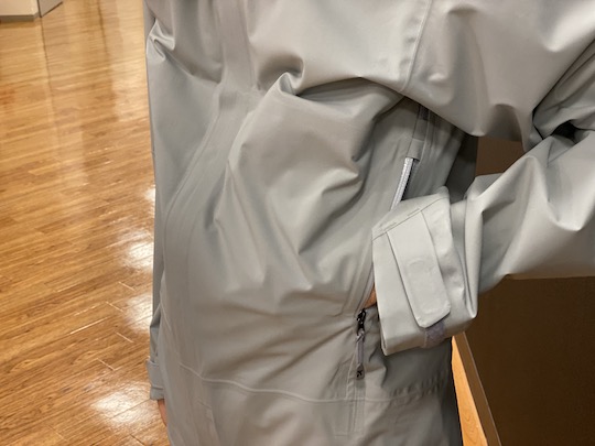 止水ジッパーを使用したハンドポケットは高めの位置にあるため、ショルダーハーネスと干渉しません。