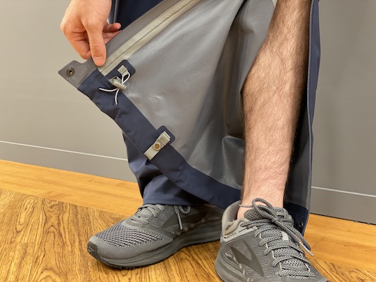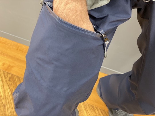 レインパンツでは省かれがちなポケットが、三カ所もあり非常に便利です。