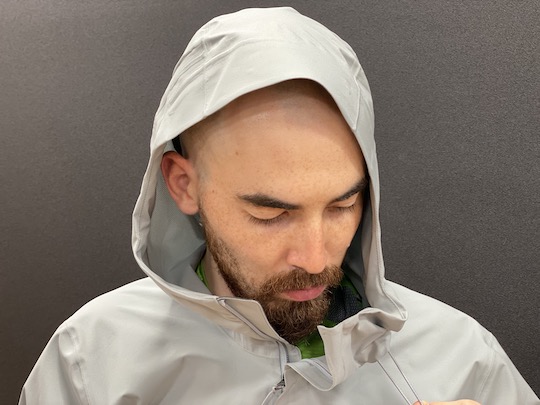 ヘルメット対応のツバのついたフード。首元と後頭部のドローコードで調整が可能。