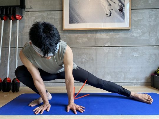 ②伸ばした方の脚を矢印の方向へ脚を閉じるように2秒力をかけます。そのあとに脱力すると身体の重みで沈み込み内転筋がストレッチします。この動作を5回繰り返します。