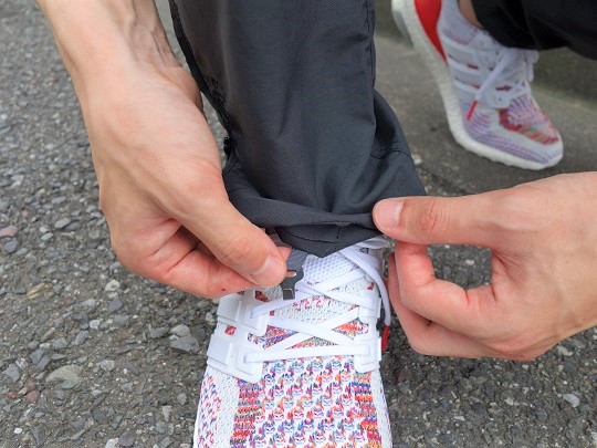 裾に付属したフックを靴紐に引っ掛けることで、岩場などで足を高く上げた際に裾のずり上がりを防いでくれます。