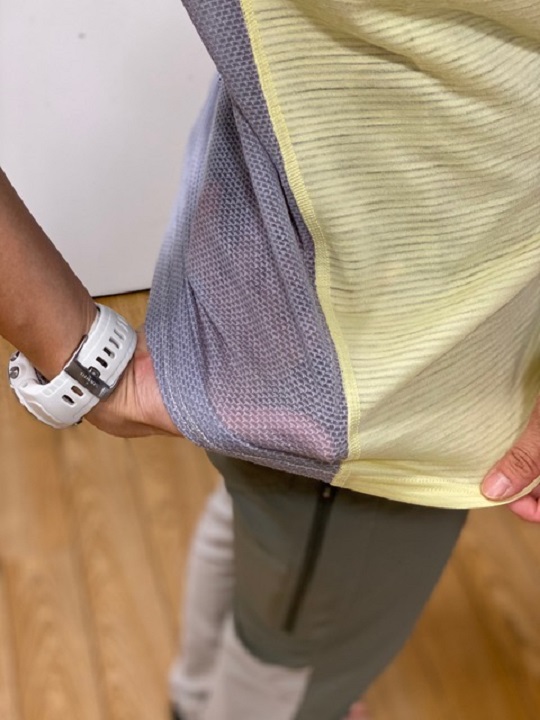 背中や二の腕などの部位には、通気性や速乾性を最大限に高めるために60% Merino Wool、40%Recycled Polyesterを使用し、メッシュパネル構造に。
