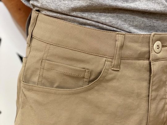 左右のハンドポケットとボタン付きのバックポケット、背面左側にはジッパー付きのセーフティポケットを配しています。