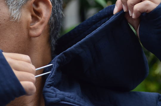 ヘルメット対応のフードは首元も高く設定されています。さらにドローコードもあり。