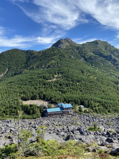長者小屋に到着。長者小屋も休業。水を補給しようと思っていたので長者小屋の休業はかなり痛手。赤岳までコースタイムで2時間ぐらい。水は空っぽ。これはマズいと小屋の前で考えているとテント場の下に水場があるのを発見。