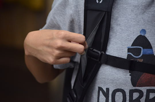 チェストベルトの端はこのように隠れているので、見た目はスッキリ。デザイン性が抜群です。