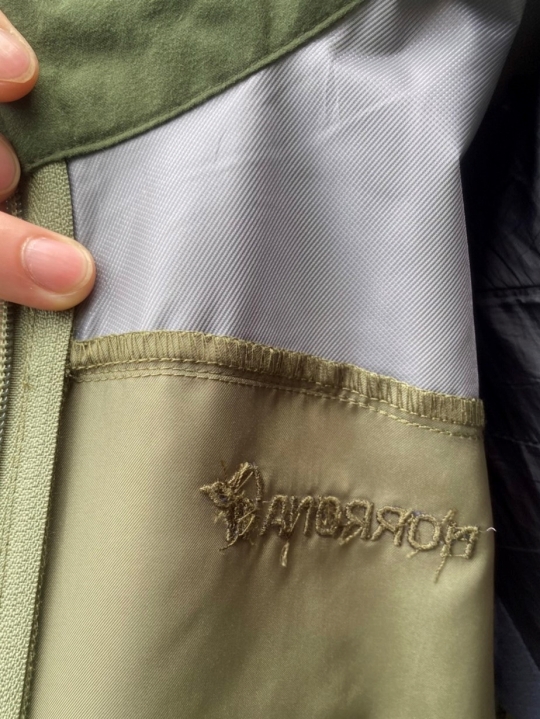 肩と肘、腕の裏地(濃いグリーンの部分)にはストレッチ性の防水メンブレンが入っていて、軽い雨や、植物の水分を弾いてくれます。