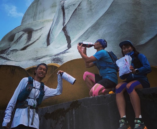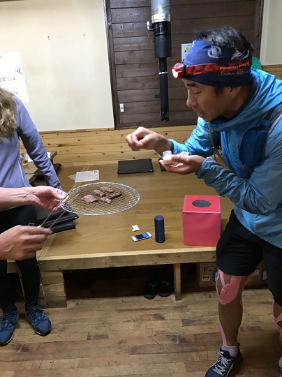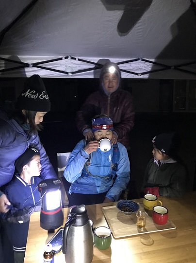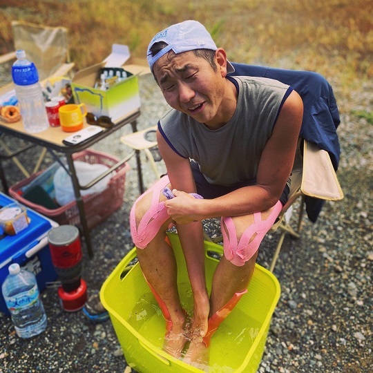 まず温泉足湯をセット。食べ物飲み物もたくさん用意され脚が攣りそうという事で何とお味噌汁まで準備。おいおい至れり尽くせりでこのままここがゴールでいいんじゃないかと思って座ってました。