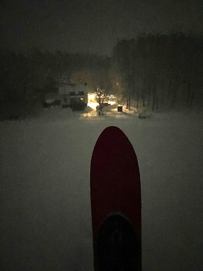 手巻き寿司とかなんて用意してもらって、紅白見ながらお酒も飲んで気分が良いうちに年が明け、おめでとうとワイワイ言い合ってる間にアウターだけ羽織って雪板を持って、目の前の月明かりだけの暗い斜面の膝パウをラッセル。