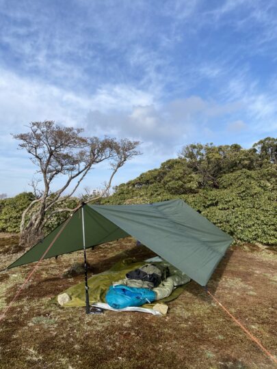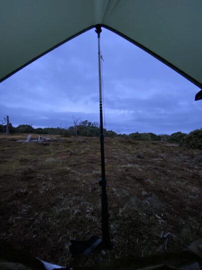 夜中目が覚めると結構な風が吹いていてタープが倒れないか心配になりながらも寝たり起きたり。気が付くと明かるなってきたので寝床からパシャリ。