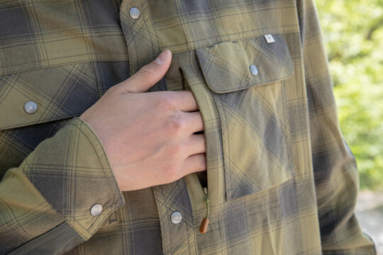ポケットは胸に2か所ボタンポケットと、左胸にファスナーポケットを完備。大事なものはファスナーポケットへ。落とすリスクが減りますね。