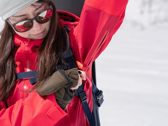 ジャケット表側にはポケット2つだけですが、ビーニーやグローブを入れられる十分な大きさを確保しています。