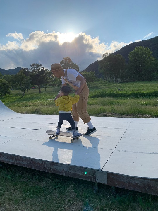 冬にスノーボードをして楽しそうだったのでスケボーも好きなんじゃないかということでランプの滑り方を教えてもらいました。