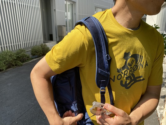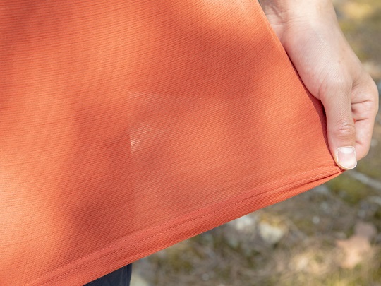 着ていて透けることはありませんが、ゆるめに織られた生地は風通しが良く、涼しく、速乾性もGood!