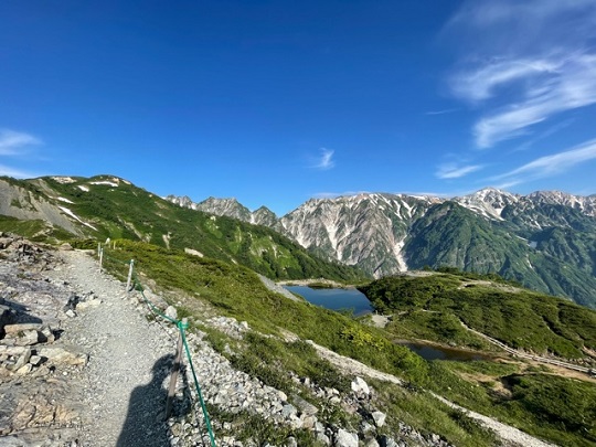 雪がない分地形の変化は感じつつもテンション上がりつつ一気に八方池まで駆け上る。