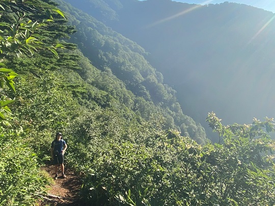 ↑の写真、トレイルがほぼ見えないくらい笹に覆われていて膝下が切り傷だらけになりました。ロングパンツ推奨です!!