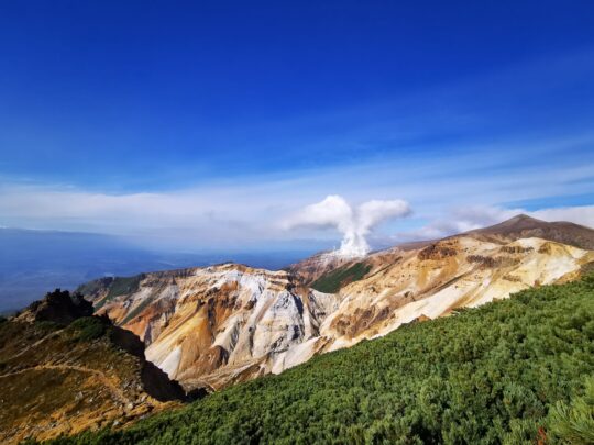 十勝岳の噴煙が青空に映えます。