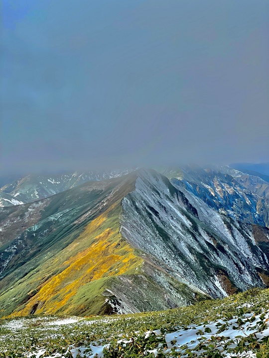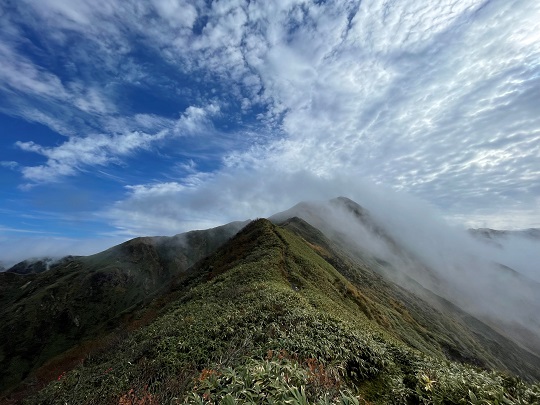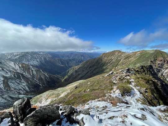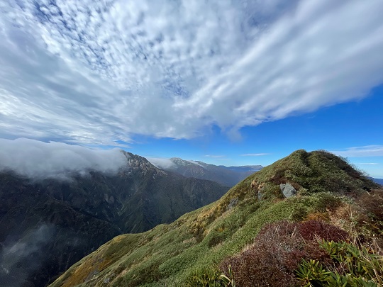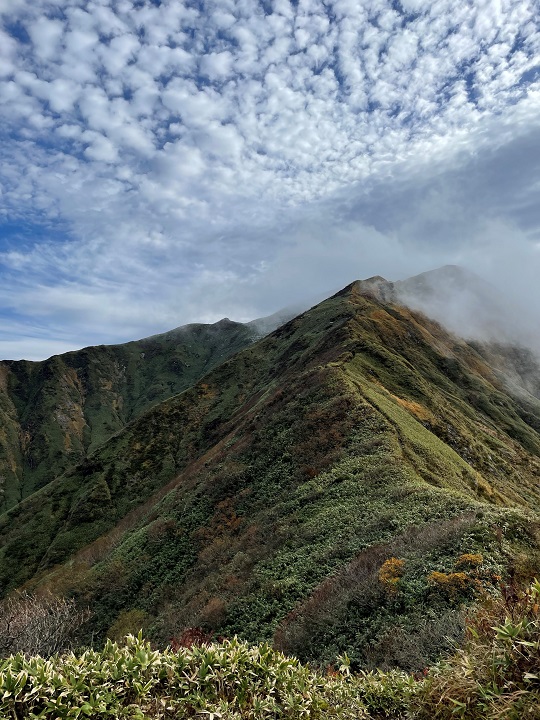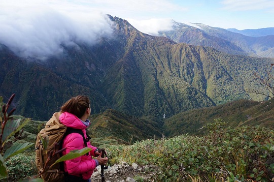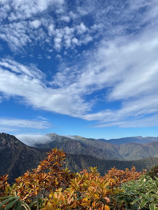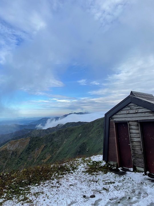 茂倉の避難小屋にお世話になり、その翌日。やっと久しぶりに山を見た。山歩いてるのに笑