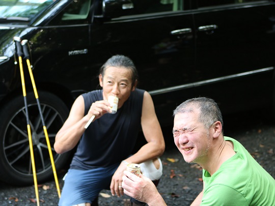 弊社社長(左)も走り、ゴール(DNF!?)後にプシュッとやっちゃいます。