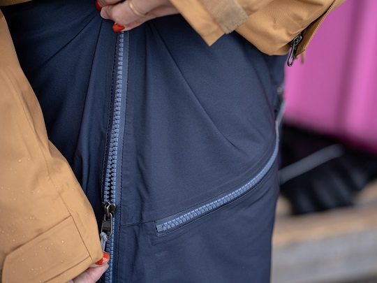 下からも大きく開けることができるので、スキーブーツやトレッキングシューズを履いたまま脱ぎ着が可能です。