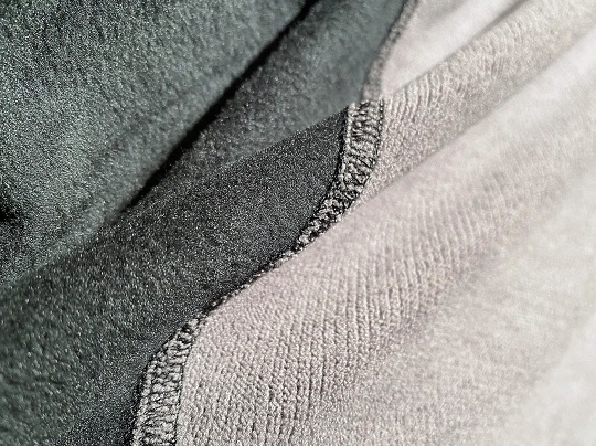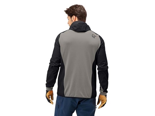 ソフトシェル部の裏地(ブラック)は毛足のあるフリースで保温性を、背中(グレー)はストレッチ性と透湿性の高い性質を持ちます。