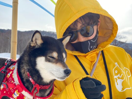 レイは寒さが苦手で目が細くなってしまいますが、最終走者で怒涛の追い上げを見せ、見事チームを準優勝に導いたお父さんをずっとまっていました。新メンバーのカレンと2ショット。