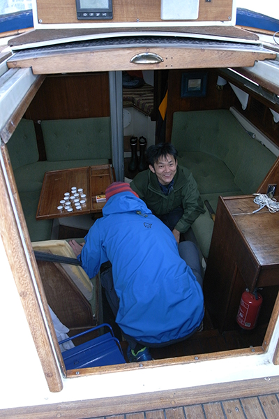 Woodのかっこいいボートですが、なんと水漏れ。Frodeくん曰く、「この水は雨漏りの水だから浸水したわけじゃない」とのこと。でもこれでどこかにセーリングするかと言われるとかなり不安かも。