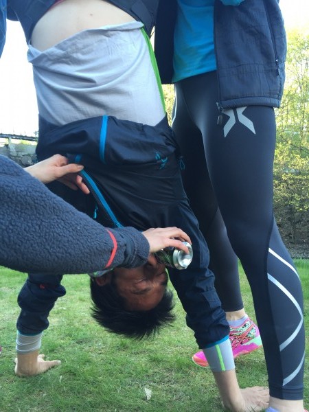 生卵投げゲームでは、野球とかを知らないこっちの連中の直球をまともにくらってすっかりたまごまみれになり、この逆立ちゲームではビールが鼻に逆流するなど大活躍だった遠藤くんでした。